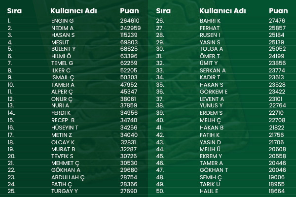 • Liderler tablosu Hafta içi her gün, gün içerisinde saat 23:59'a kadar güncellenecektir. Ancak ilk sıralama listesi 4 Aralık 2018 tarihinde açıklanacak ve 1,2,3 Aralık tarihlerini kapsayacaktır.